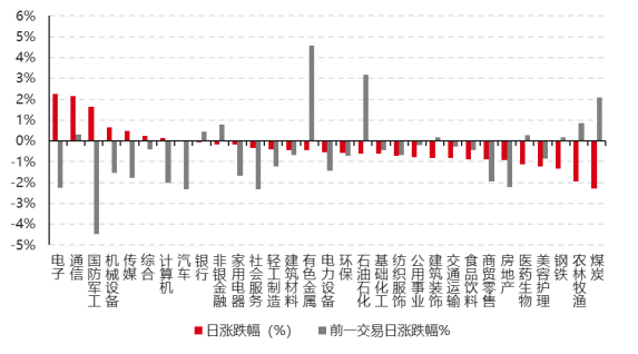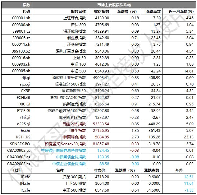 31個(gè)申萬一級行業(yè)中有8個(gè)行業(yè)上漲。其中,電子、通信、國防軍工表現(xiàn)居前,漲跌幅分別為2.27%、2.15%、1.65%,鋼鐵、農(nóng)林牧漁、煤炭表現(xiàn)居后,漲跌幅分別為-1.34%、-1.95%、-2.27%。滬市有1427只個(gè)數(shù)上漲,占比60.93%,深市有1855只個(gè)數(shù)上漲,占比63.53%。非ST個(gè)股中,53只個(gè)股漲停,2只個(gè)股跌停。股指期貨主力合約漲跌不一,其中,1只期指好于現(xiàn)貨指數(shù)。